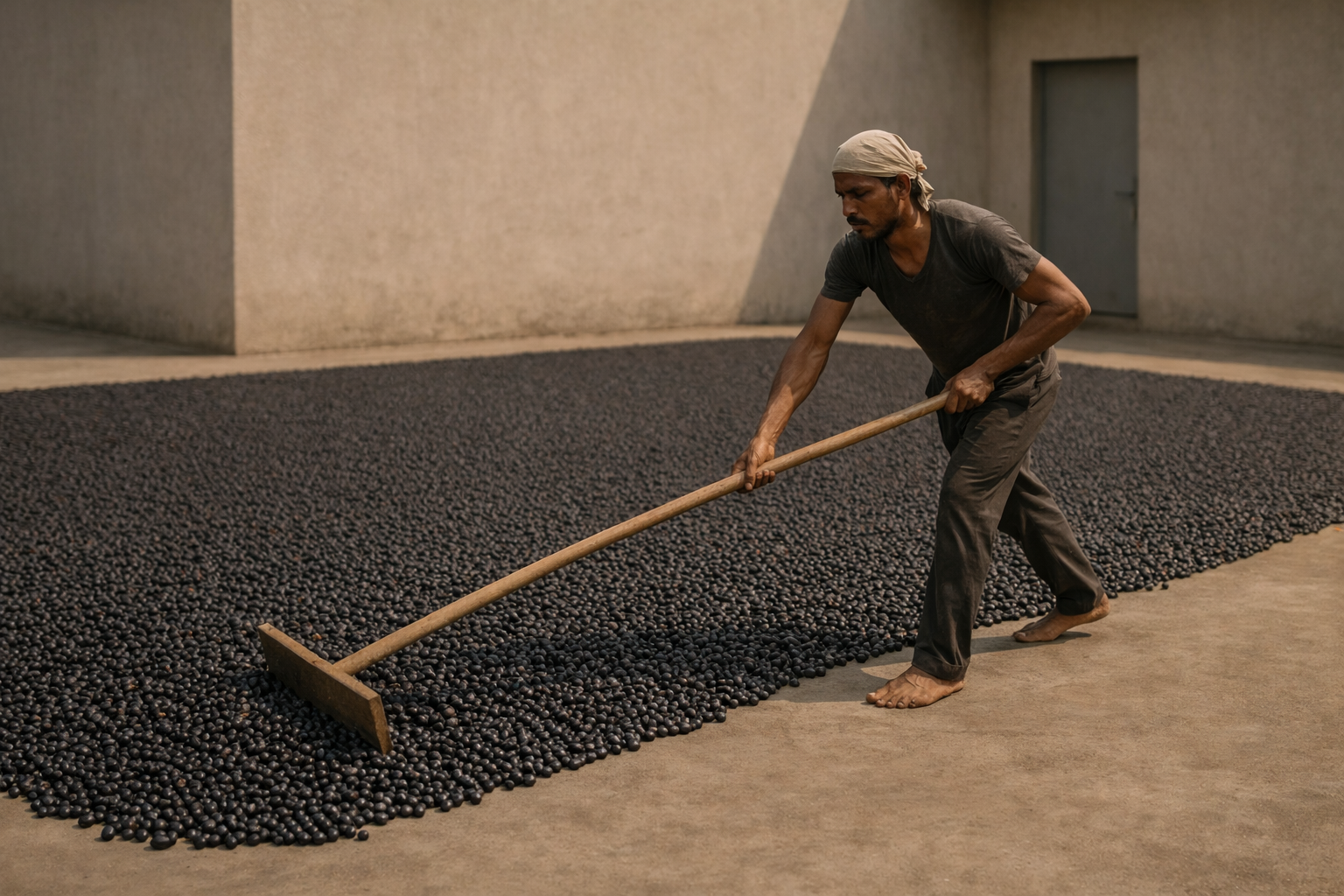 The seeds are evenly spread and sun-dried to lower their moisture content