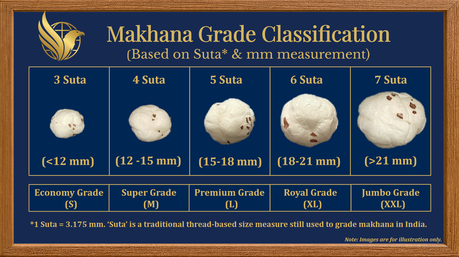 *1 Suta = 3.175 mm. Historically, traders used a threaded string (“Suta” in Hindi) to measure the number of makhana pieces that fit in a line. Over time, this became a standard grading unit, still in practise in Makhana industry.